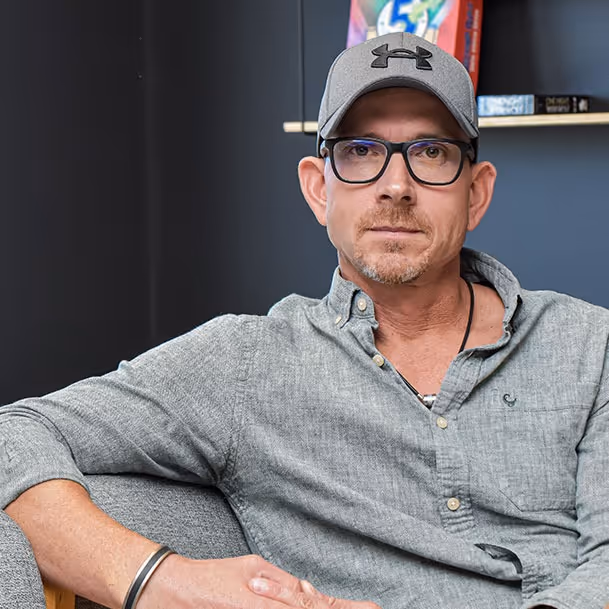 Smiling man in a black Bob.co.za hoodie with arms crossed, standing against a purple background.