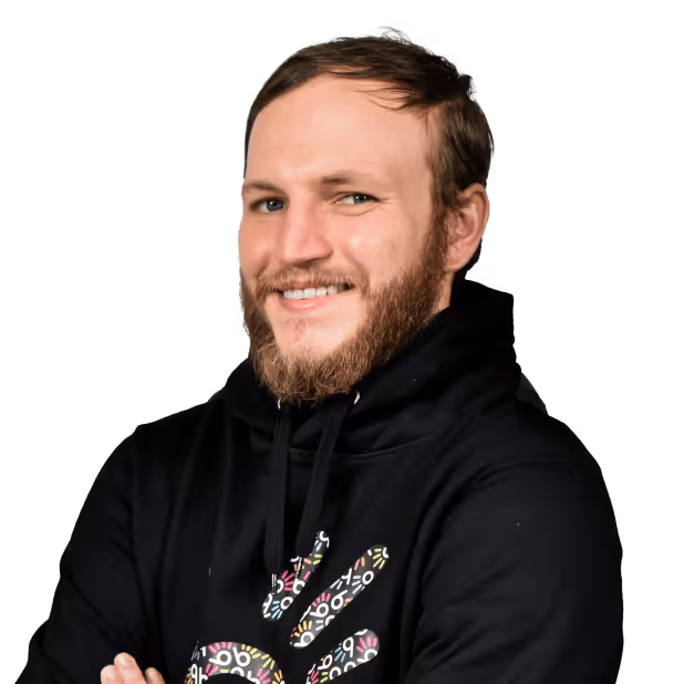 Smiling man in a black Bob.co.za hoodie with arms crossed, standing against a purple background.